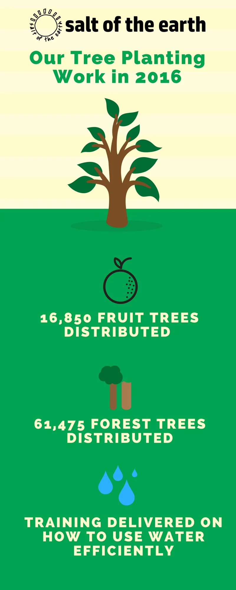 SOTE’s work with the rural poor in Tamil Nadu has a huge emphasis on the environment. Last year, SOTE delivered a tree planting project to help with environmental preservation in Tamil Nadu. SOTE believe that trees are so important and can provide food, fuel, shelter and fodder and are a vital part of our work. In 2016, SOTE distributed 16,850 fruit and 61,475 forest trees to marginal farmers, Women’s Self Help Groups (WSHGs) and schools.